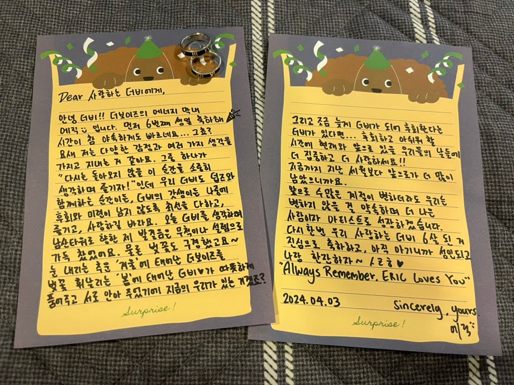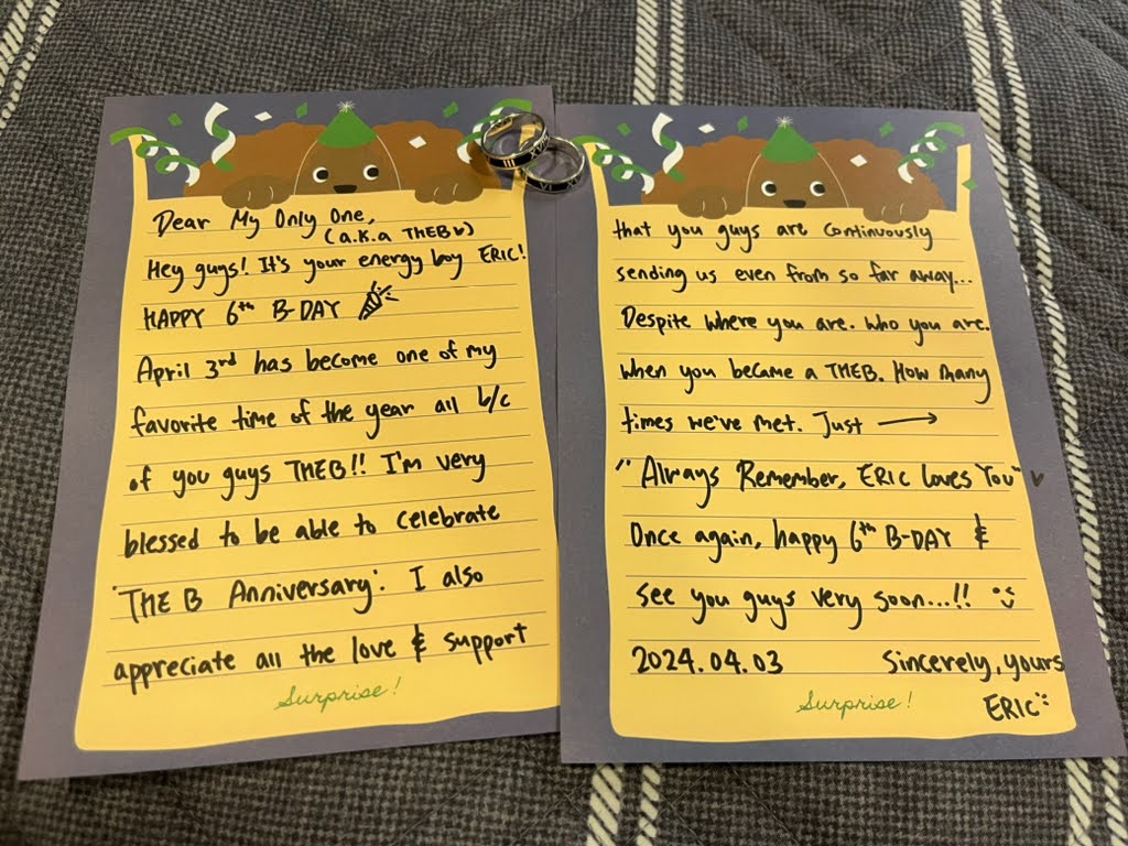 Hi, TheB!! It's THE BOYZ's energy maknae Eric :) First, happy 6th birthday 🎉 Time goes by so mercilessly fast... Right?